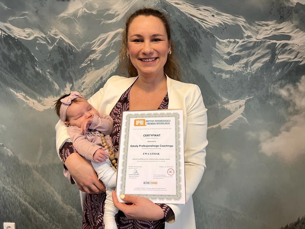 Decyzja o zostaniu coachem była dla mnie kluczowym momentem życiowym. Wymagała odwagi, zaangażowania i otwartości na nowe. Pamiętam, jak odkładałam zapisanie się do szkoły coachingu, bo obawiałam się, że plany związane z drugim dzieckiem mogą przeszkodzić mi w ukończeniu kursu i rozpoczęciu praktyki. Mimo to, podjęłam decyzję. I chociaż pierwszego dnia zajęć dowiedziałam się, że jestem w ciąży, ukończyłam szkołę z dumą i radością – a na uroczystości odebrania certyfikatu towarzyszyła mi moja dwumiesięczna córka.